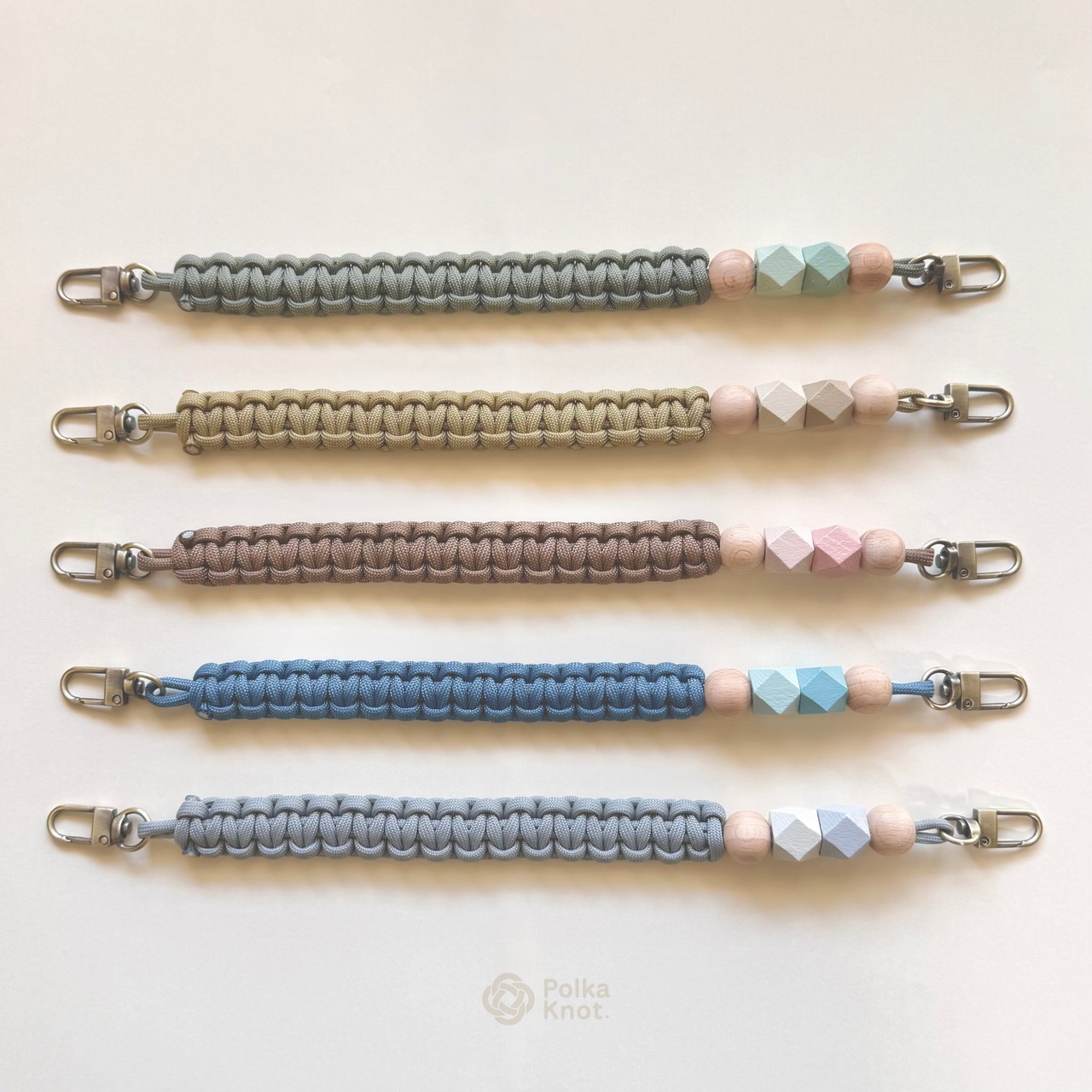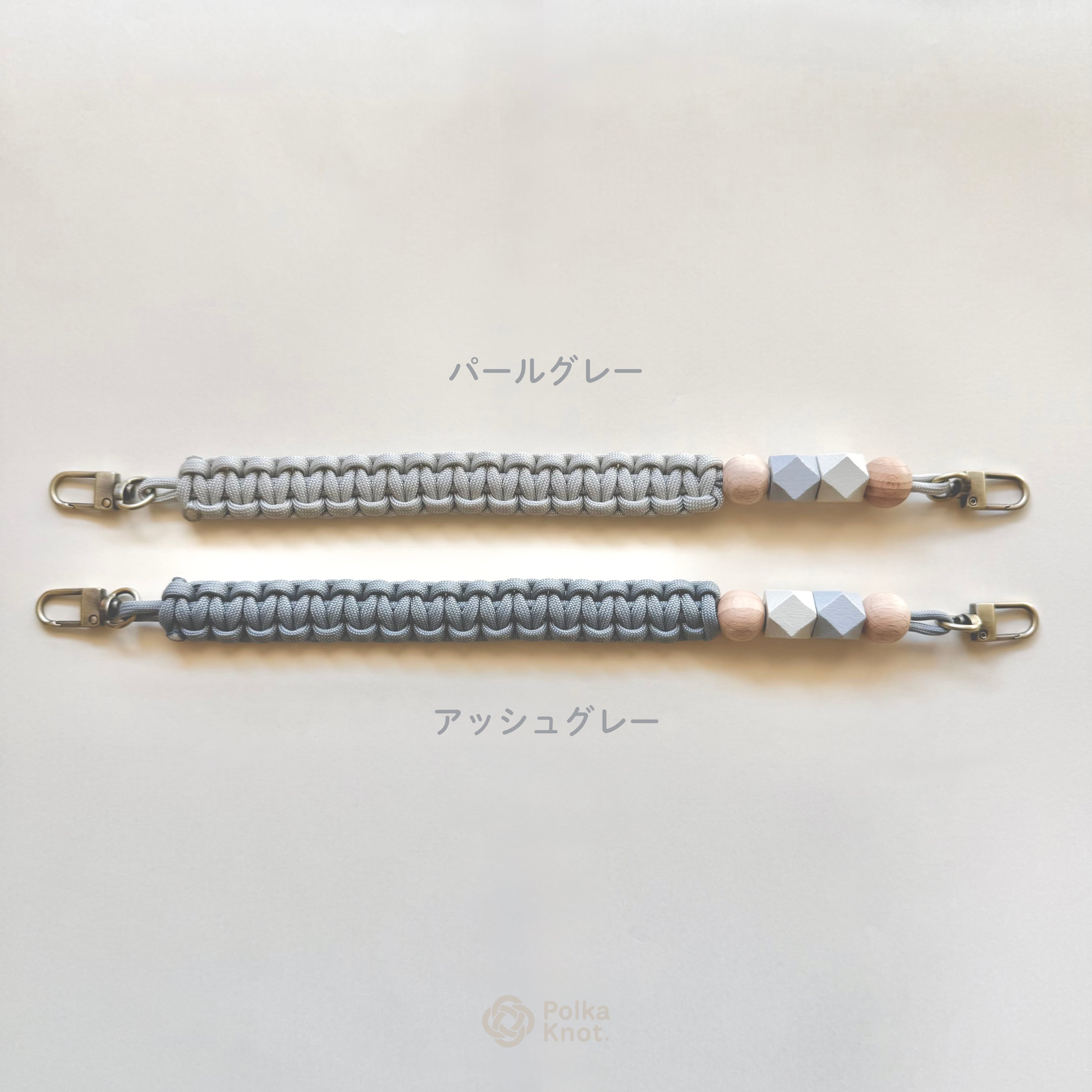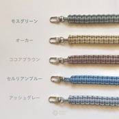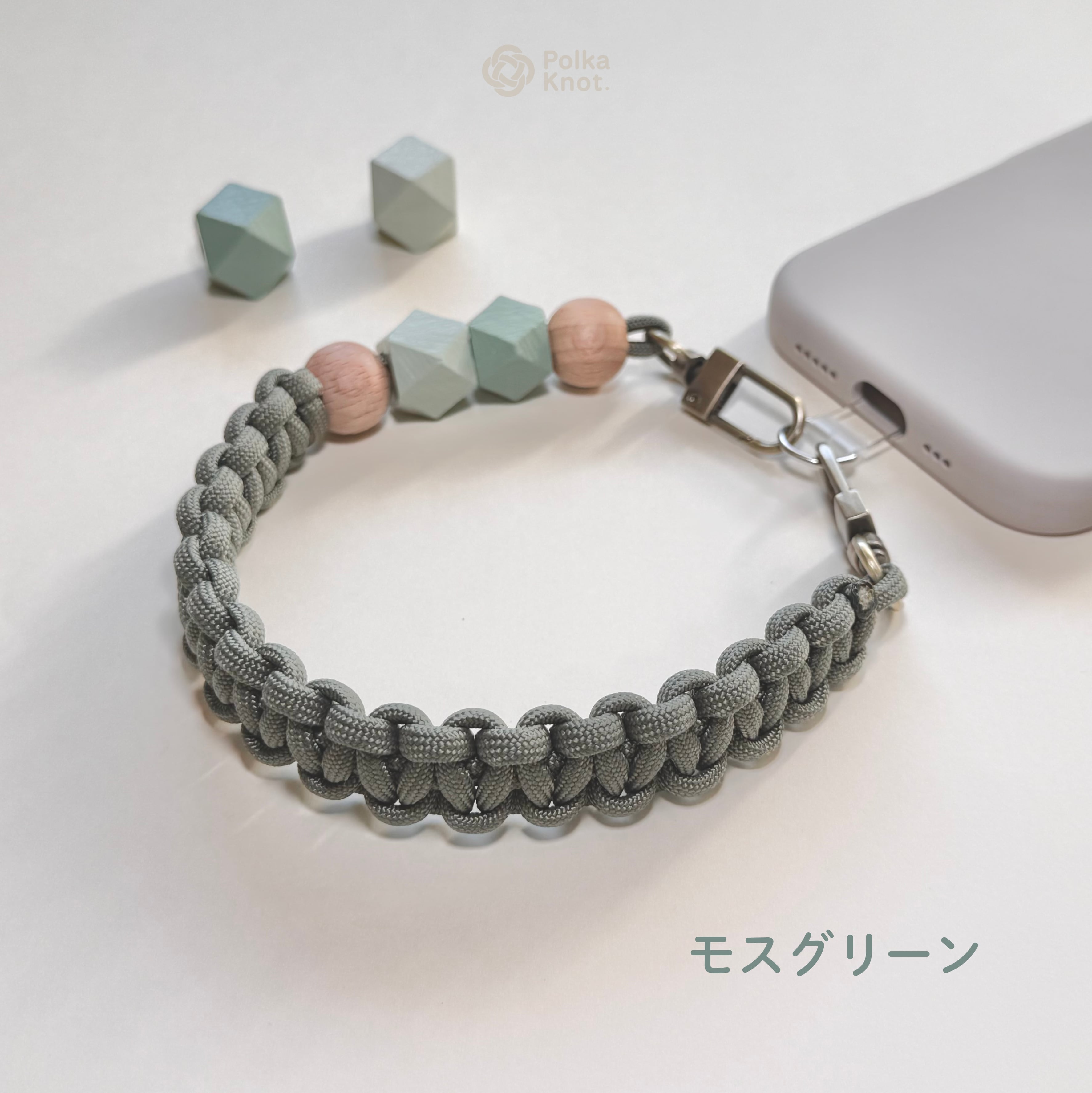 落ち着いたくすみカラーのパラコードを一つひとつ手作業で丁寧に編み上げたスマホ用ハンドストラップ(リストストラップ)。
